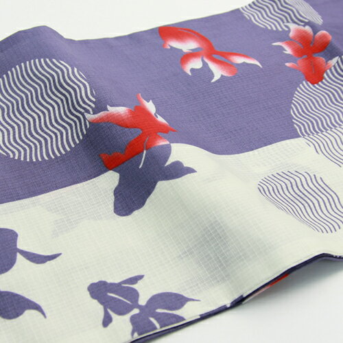 生成りと紫の染め分け地に金魚と水玉が配された大人の女性にオススメの上品なお柄です。