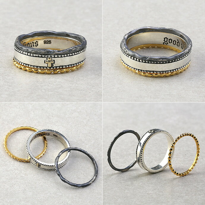 3つのリングはそれぞれ、クロスモチーフが付いたリング、古美加工が施された味のあるリング、丸が連なった形のゴールドコーティングリングと個性豊か。
